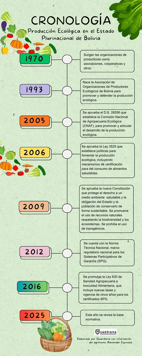 Los Sistemas Participativos de Garantía (SPG) tienen historia en Bolivia. Si bien sus antecedentes van hasta 1970 cuando surgieron organizaciones de productores como asociaciones y cooperativas, recién con la aprobación de la Ley 3525 en 2006 se sembró la semilla de lo que serían los SPG.