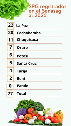 En un webinar internacional que contó con la presencia de especialistas de Bolivia, Argentina y México, el agrónomo Alexander Espinoza explicó a nombre de Agrecol Andes que hasta mediados de 2025 existían en Bolivia 77 SPG (cada uno aglutina a un grupo de productores), en 83 municipios, con 7.680 familias involucradas. La Paz lidera en número, seguido de Cochabamba como se puede observar en el siguiente cuadro. No deja de llamar la atención el hecho de que Santa Cruz cuenta únicamente con 5 SPG, a pesar de ser uno de los departamentos con mayor población en el país.