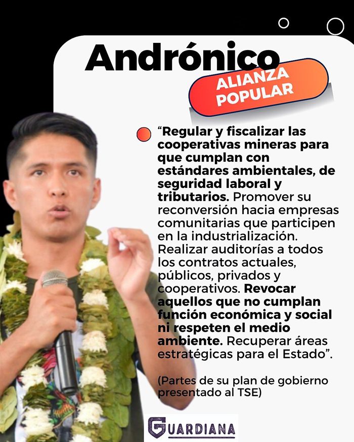 El candidato de Alianza Popular le dedica 13 párrafos a la minería en su plan de gobierno. Hace notar que a pesar de que los recursos naturales son estratégicos y del pueblo boliviano, “la cadena productiva minera continúa siendo dominada por intereses privados, sin una política sostenida de industrialización. La minería estatal es débil, las cooperativas no siempre cumplen su función social...”. Por eso cree que aún “no existe una estrategia nacional consolidada para insdustrializarlos (lito, cobre, estaño y otros), protegerlos de la depredación y convertirlos en motores de un desarrollo soberano. No menciona en la lista al oro; pero al hablar de cooperativas mineras, se infiere que también se refiere a las que explotan ese mineral.