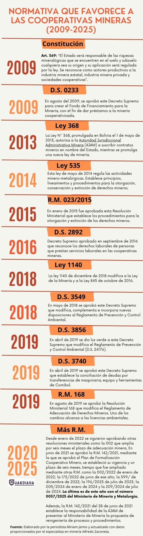La influencia de los cooperativistas mineros en el poder se hizo sentir en Bolivia desde la misma promulgación de la nueva Constitución en 2009 y luego en una serie de leyes, decretos supremos y resoluciones ministeriales a favor a los cooperativistas mineros como se puede ver en la siguiente infografía.