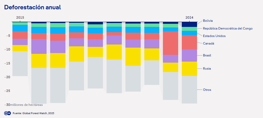 Durante las últimas dos décadas, la cantidad anual de cobertura arbórea perdida ha aumentado gradualmente. Rusia, Brasil y Canadá fueron los principales impulsores de la deforestación en 2024.