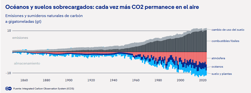 Desde el comienzo de la industrialización, las emisiones de CO2 derivadas de la quema de combustibles fósiles han seguido aumentando. Al principio, no fue tan problemático: la Tierra absorbía cada tonelada adicional de CO2 que producían los seres humanos, en "sumideros de carbono" naturales como los bosques y los océanos.