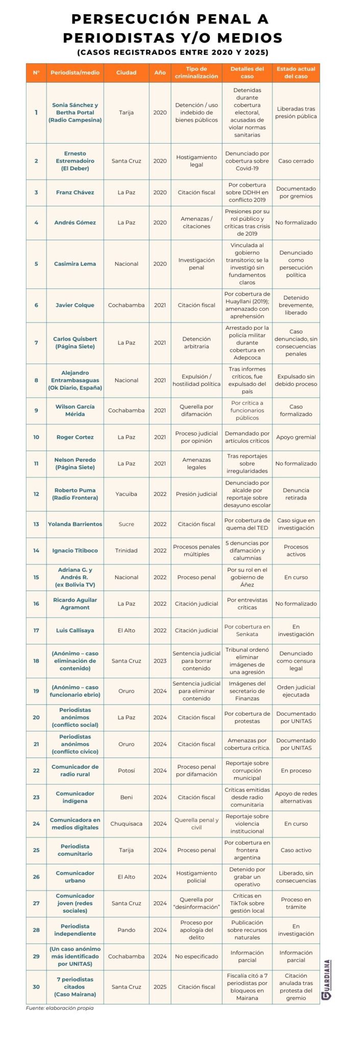 Entre 2020 y 2025, Bolivia ha experimentado un preocupante patrón de judicialización del ejercicio periodístico. Según los informes del Observatorio de Defensoras y Defensores de Derechos de la Red UNITAS, durante este periodo se documentaron 30 casos de criminalización y judicialización de periodistas, con el siguiente desglose: 5 casos en 2020, 6 casos en 2021, 6 casos en 2022, 1 caso en 2023, un significativo repunte con 11 casos registrados en 2024 y 1 caso que implica a 7 periodistas en 2025.Las cifras reflejan una tendencia sostenida y también una escalada en el uso del sistema judicial como mecanismo de presión y castigo contra el periodismo. A continuación, se detallan los casos registrados:
